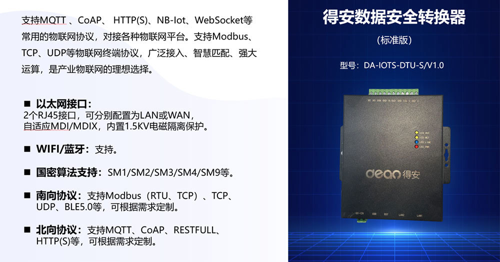 支持MQTT、CoAP、HTTP(S)、NB-lotWebSocket等常用的物聯網協議,對接各種物聯網平台。